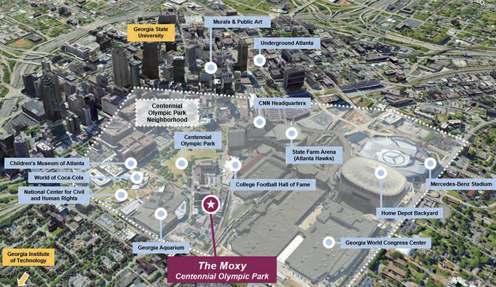 호텔 위치는 애틀란타 다운타운의 정중앙입니다. 도보 5~10분 거리에는 다음과 같은 글로벌 랜드마크들이 있습니다. 즉, 관광 + 스포츠 + 비즈니스 + 컨벤션 + 교육 + 오피스 모든 수요가 한 곳에 모여 있는 지역입니다. 호텔 시장에서 이 정도 입지는 뉴욕 맨해튼, LA Downtown, 워싱턴 D.C. 내셔널 몰 급의 프라임 코어에 해당합니다.